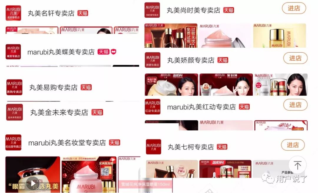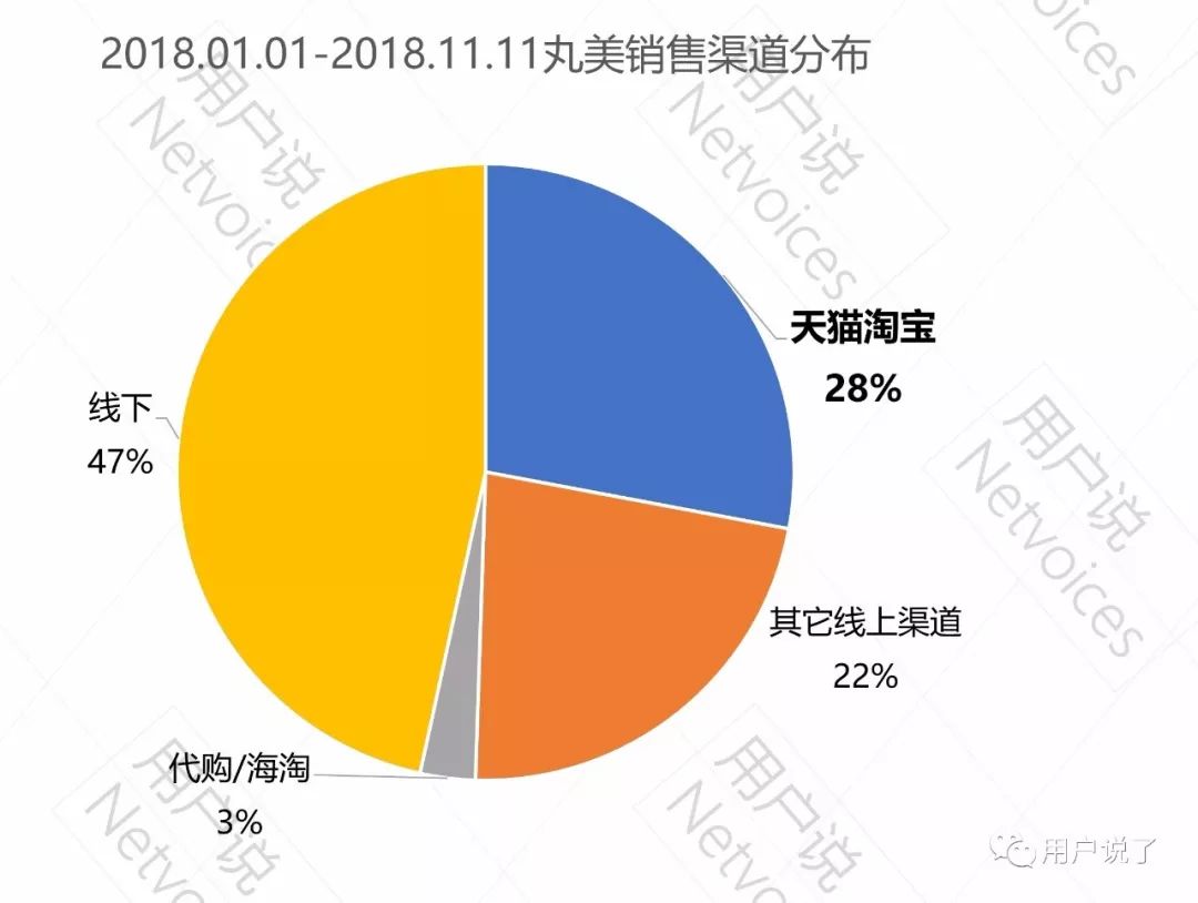 丸美天猫淘宝渠道占总销售渠道的28%,其中,天猫除丸美旗舰店之外还有九个“丸美专卖店”,品牌整体销售渠道较为发散,线下渠道占比最高。