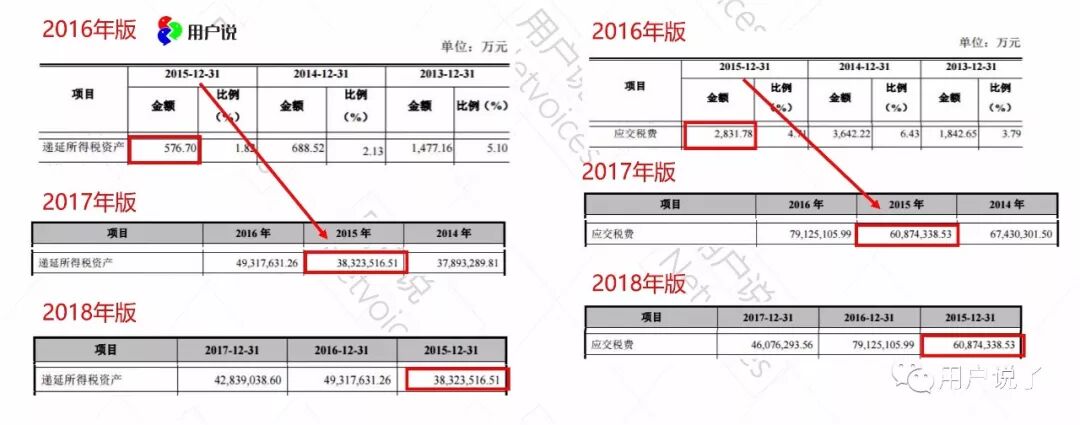 丸美生物2016年与2017、2018年的招股说明书部分数据不一致。2016年招股说明书中,2015年度的资产(流动资产、非流动资产)、负债(流动负债)项目的金额均少于2017年和2018年版本(2017与2018年的招股说明书中数据一致);其中,“递延所得税资产”、“应交税费”项目的金额在2016年版本中甚至比后两年分别少了三千多万。