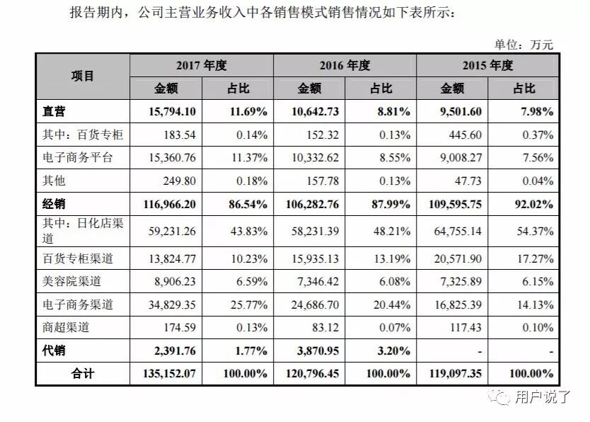 2015-2017年度丸美生物主营业务收入中经销渠道占比分别为92.02%,87.99%和86.54%,略有下降但没有改变整体销售结构,公司经销收入分别为109595.75万元,106282.76万元,116966.20万元。