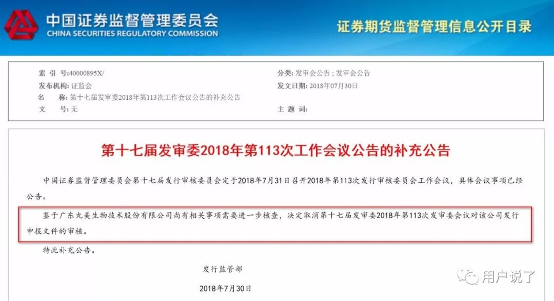 今年7月30日,证监会发布《第十七届发审委2018年第113次工作会议公告的补充公告》中表示,“鉴于广东丸美生物技术有限公司尚有相关事项需要进一步核查,决定取消第十七届发审委2018年第113次发审委会议对该公司发行申报文件的审核。”