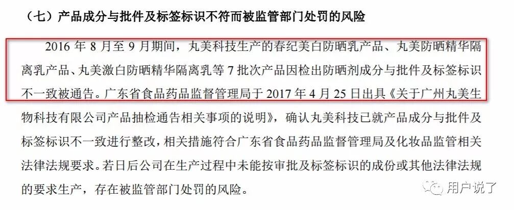 丸美生物也是记吃不记打,IPO被拒绝多次仍抱有侥幸心理。在最新的招股说明书“产品成分与批件及标签标识不符而被监管部门处罚的风险”中只提到2016年被通告批评的事情,对2017年再次因防晒类化妆品不合格被CFDA通告批评的事实只字不提。