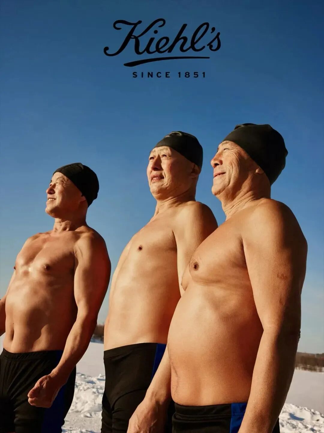 除了知名运动员,2025年2月科颜氏将镜头对准雪地中赤膊冬泳的普通大爷,通过风雪、汗水、皱纹等真实元素,传递“去精致化”的品牌态度,关注户外运动场景中的普通人。冬泳场景的低温、强风、雪地反射紫外线多重严苛挑战,对美妆产品提出了更高的要求,而大爷们健康的肌肤状态直观印证了科颜氏保湿霜等产品在严苛环境下的有效性。