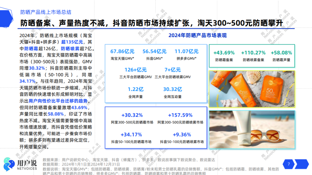 据用户说研究中心数据显示,2024年防晒品类在淘天、抖音、拼多多三大平台的GMV已达到135.47亿,防晒霜备案量激增43.69%、声量同比增长58.08%。此外,京东618的全周期报告显示,超高倍防晒霜成交额增长140%,清晰表明消费者对极端环境下强效、稳定防护的迫切需求。
