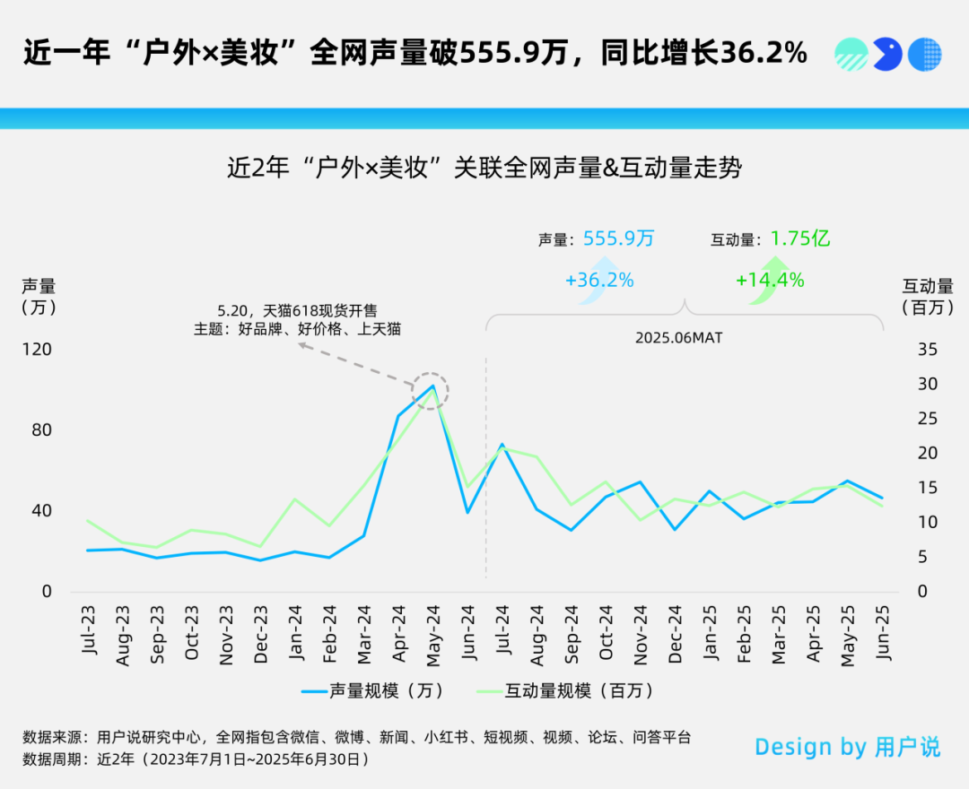 据用户说研究中心数据显示,在2025.06MAT期间,全网“户外+美妆”的声量已飙升至555.9万,同比增长36.2%,相关话题全网的互动量已达1.75亿,户外美妆的关注度达到了前所未有之高,不少女性健身爱好者既注重在运动中释放自我,也同样追求能够通过在健身中的精致妆容与穿搭带来心理上的加倍愉悦。