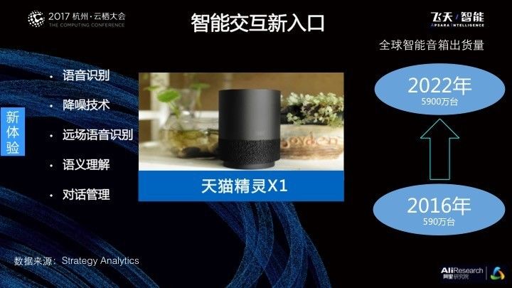 以阿里发布的天猫精灵智能音箱为例,目标就是在抢占智能交互的新入口。语音识别技术未来还需要不断迭代,在识别方言和多语言方面的能力还有待提高,在降噪技术、远场语音识别、语义理解以及多轮对话管理方面的技术有待完善。