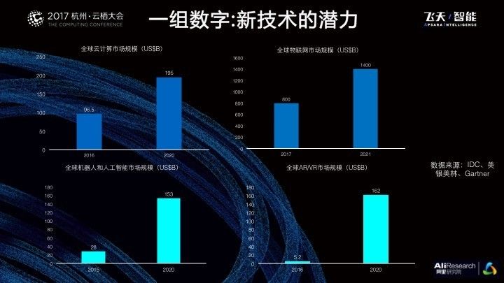 同时,我们可以从第三方研究公司的数据看到新技术的潜力。我在这儿并没有一一列举,只是选取了几个核心技术,像云计算、物联网、机器人和人工智能以及VR/AR等技术方向,这几个目前非常受关注的技术的未来潜力都是大家非常看好的,而且规模从千亿美金到万亿美金不等。