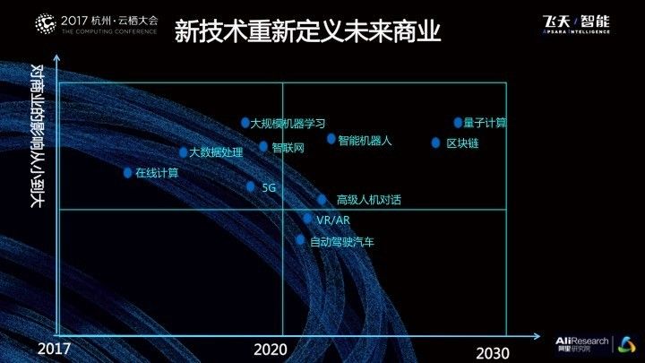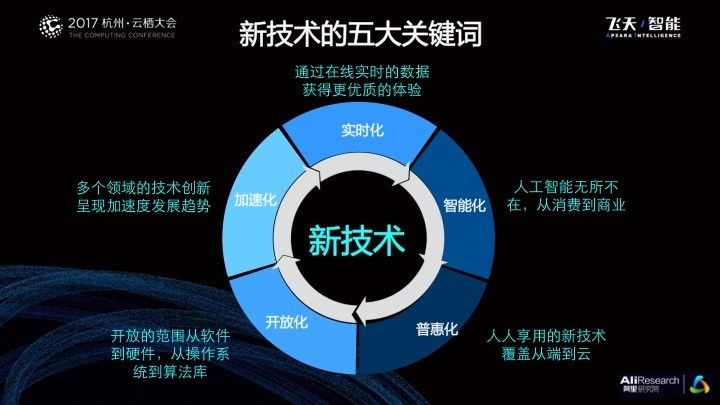 从行业的角度来说,新技术体系可以用“四个新”来概括:新基础、新智能、新体验、新应用,以量子计算、5G和AI芯片为代表的新基础,以在线计算、大数据处理和大规模机器学习为代表的新智能,以机器智能、人机自然交互、无人驾驶和VR/AR为示例的新体验,以及智联网、区块链、安全、新零售、城市大脑、工业大脑等典型新应用。