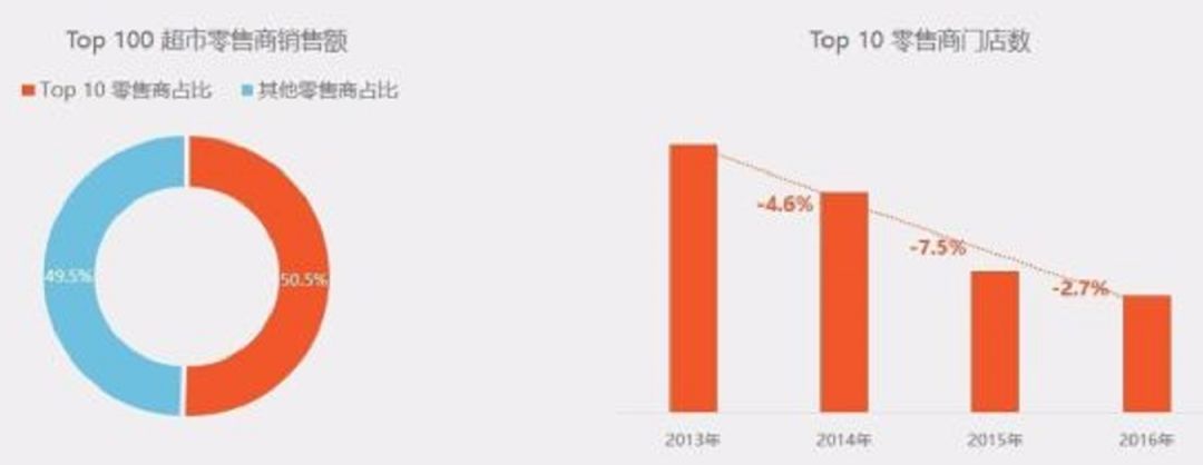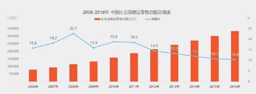 从一组数据来看零售发展的态势。第一个是说消费品增速还在提升,虽然整个GDP发展是放缓,但零售消费还是增长的。从Top100超市零售这一部分的数据来看,虽然是放缓,但是它也是有一定的增加。
