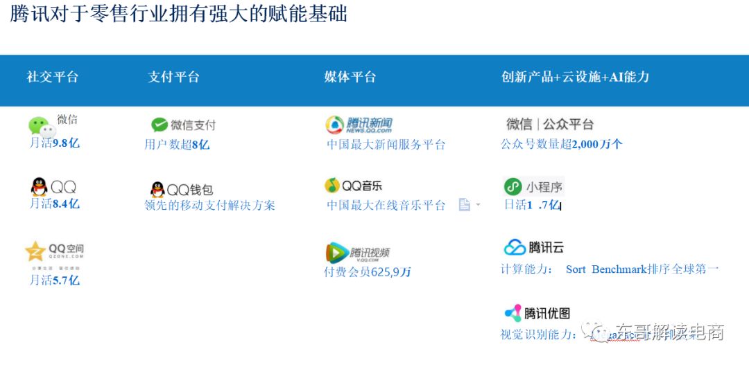 关于未来零售布局,都在说“人、货、场”,阿里和京东的模式虽然有差别,但都是自己在不同领域尝试搭建“人、货、场”,而只有腾讯是提供底层技术支持,让商家、服务商们自己通过创新构建场景。