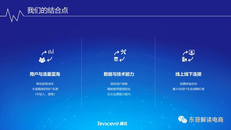 1月29日,腾讯作为主发起方,联合京东,340亿元战略投资万达商业。万达商业变成了腾讯在线下商业场景里面至关重要的一个环节,以微信电商生态为代表的腾讯智慧零售布局,与阿里的新零售、京东的无界零售,都是互联网的发展对传统零售业的融合。