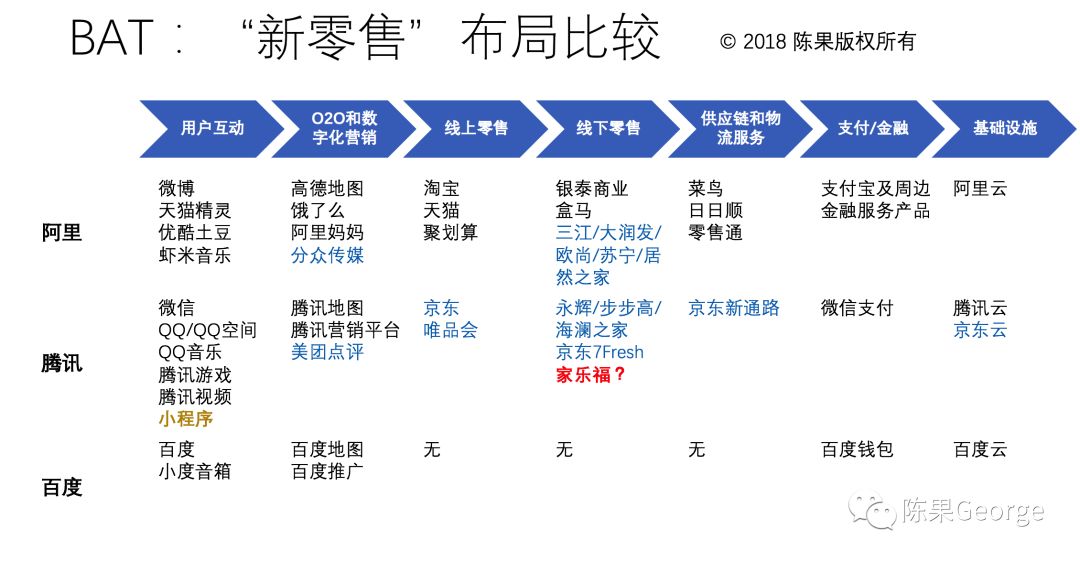 我顺手整理一下中国三家互联网公司的新零售战略版图,如下图。此外,小米、网易两家也可列入新零售候选的代表,而BAT三家,百度目前新零售战略还不甚清晰,去年还把O2O业务卖给了阿里系的饿了吗。