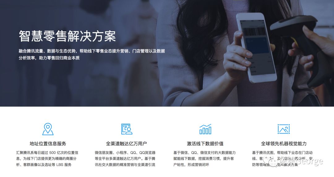 我的确很佩服阿里再造零售行业的雄心,不过这也是天猫/淘宝占据了中国线上零售流量大部份(大约60%)的自然结果。从上图的布局看,我认为,阿里是要做真正的零售商!腾讯在去年底入局零售行业(下图是腾讯云网站上“智慧零售解决方案”介绍),我观察其本意是用腾讯云的数据和技术去赋能传统零售,抗衡阿里的零售行业扩展。从两家公司的组织架构来看,阿里的新零售挂在天猫业务下,而腾讯的新零售挂在腾讯云下,也能说明“新零售”在阿里、腾讯的总体商业版图里的定位。