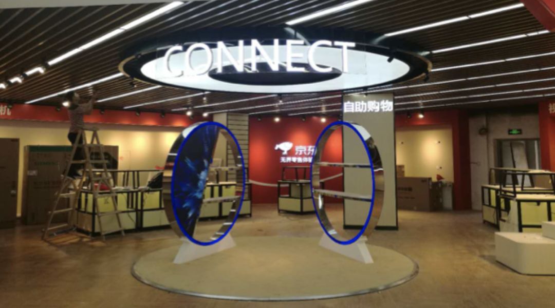 在实体双品牌门店里面,我们统一进行运营管理和顾客服务,通过引进部分数字化设备及黑科技赋能线上线下一体化,譬如,秒级完成数据同步,商品变价的电子价签,通过摄像头识别顾客的性别、年龄等信息,给出当前人物关键词(例如:潜力股、情商高、颜值担当等),再结合后台算法、模型,进行商品推荐的互动设备,也有通过65寸人脸识别大屏,虚拟展示除现场出样外的多个商品,同时系统后台记录商品展示、扫码等一系列顾客行为数据等,同步进行一些推荐应用。如下图1,是安徽黄山即将开业的我们五星电器实体门店内部情景,图2是在福建福州和JD拓展性的区域进行双品牌门店联动的场景: