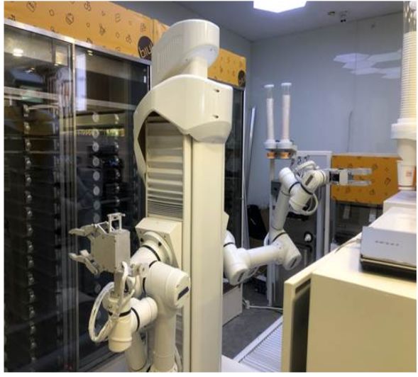 “核武器”之二便是拟人型双臂机器人。近期,在位于南京的一家苏宁小店里出现了一个全能三头六臂的“大厨”!无论是奶茶、果汁,还是打甜筒、煮咖啡,甚至现做热乎乎的便当,“他”都能胜任,吸引人无数用户的围观与好评。然而,这位让人啧啧称赞的是这位全能大厨并非人类,而是一个心灵手巧的机器人!据悉,这位心灵手巧的“大厨”是苏宁易购Biu的拟人型双臂机器人,该机器人拥有类似人体手臂结构,可以上下左右360度全方位运动。能够将诸多食材配置成新鲜的食物,比如通过双臂的协同配合和精密控制,制作早餐、果汁、咖啡、便当、冰激凌等。而消费者只要通过触屏下单并支付,机器人大厨就开工咯,他能完成从下料配料,到端送的所有环节。值得注意的是,由于机器人可以进行24小时全天候服务,这也成为全国首家无人苏宁小店落地的重要元素。