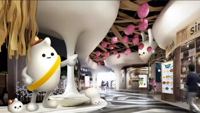 面粉团儿趣味化形象角色配合装修造型,作为空间主题形象入口,面条设计元素散布于空间各处,打造出“面粉星球”的空间概念。