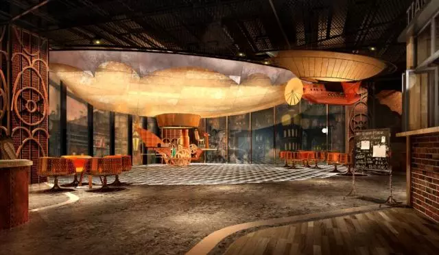 悬置于半空的飞艇,巧妙运用做旧的帆布材料,粗犷却摩登十足。