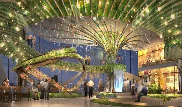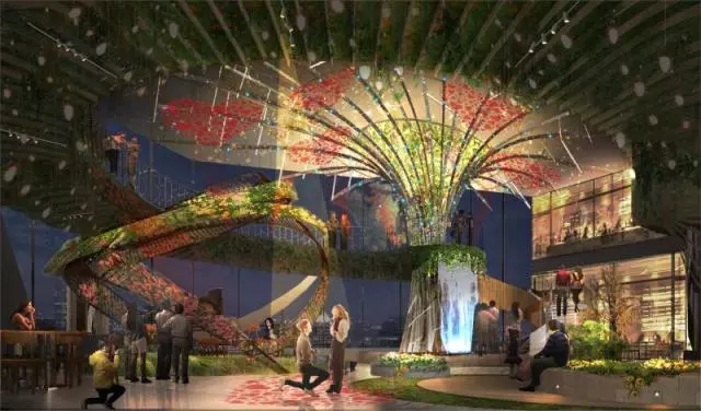 透明玻璃幕墙,全天候自然采光让人恍如踱步于青葱天地之间,更有四季气候灯光模式设计,让这一“江南庭院式”浪漫爱情空间,充满世易时移的灵动。