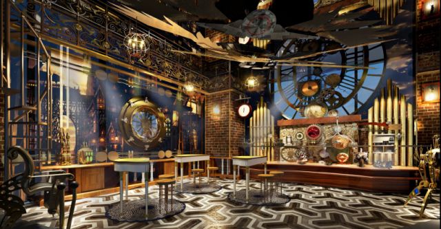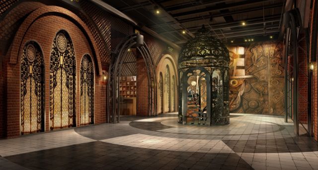 金属是表现工业风的重要材质,在空间入口处,铁艺吊灯、金属框架还有复古齿轮,都凸显着蒸汽朋克的硬朗,打造一条时光隧道让人们瞬间从时尚潮流的现代生活移步至粗狂不羁的旧工业时期。