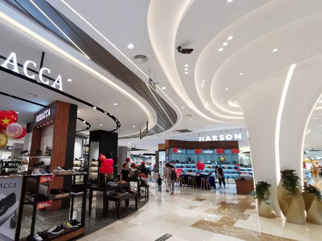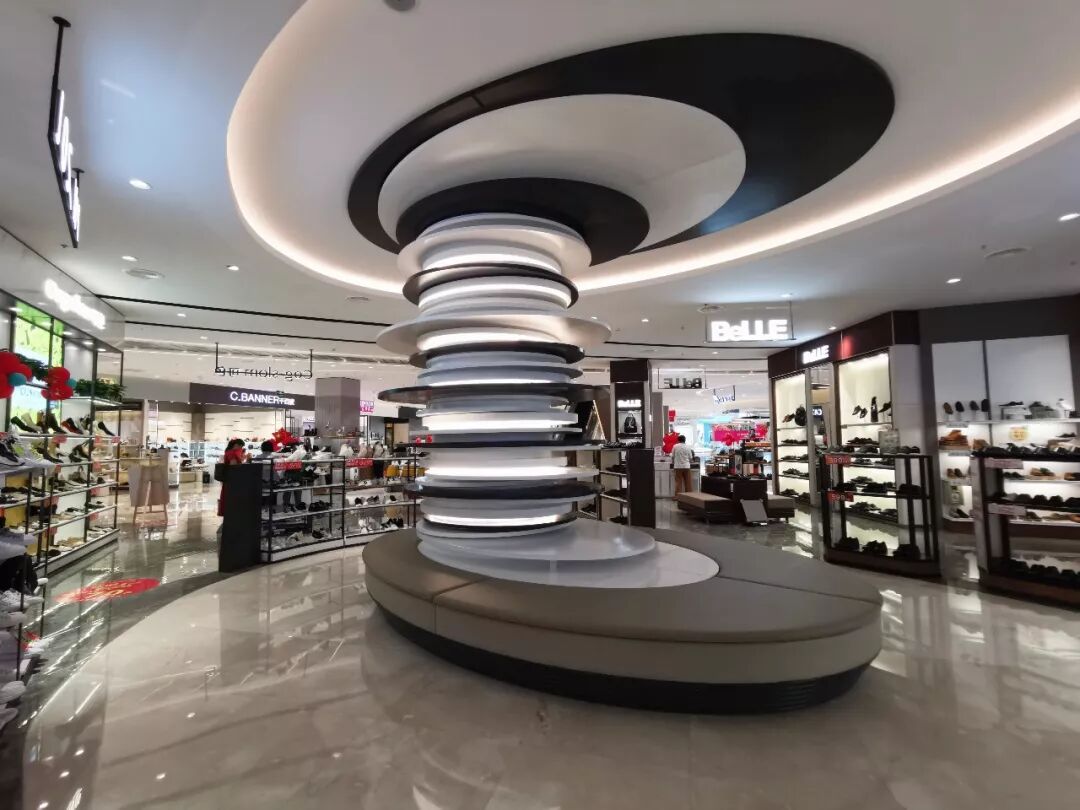 公共试鞋座造型也十分有趣,由多层烤漆板为材质,通过形体叠加,结合灯光打造柱体造型,更具时尚感和艺术感,打破传统试鞋区单调、乏味的形象。