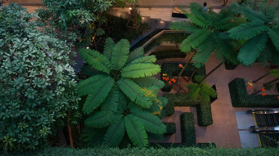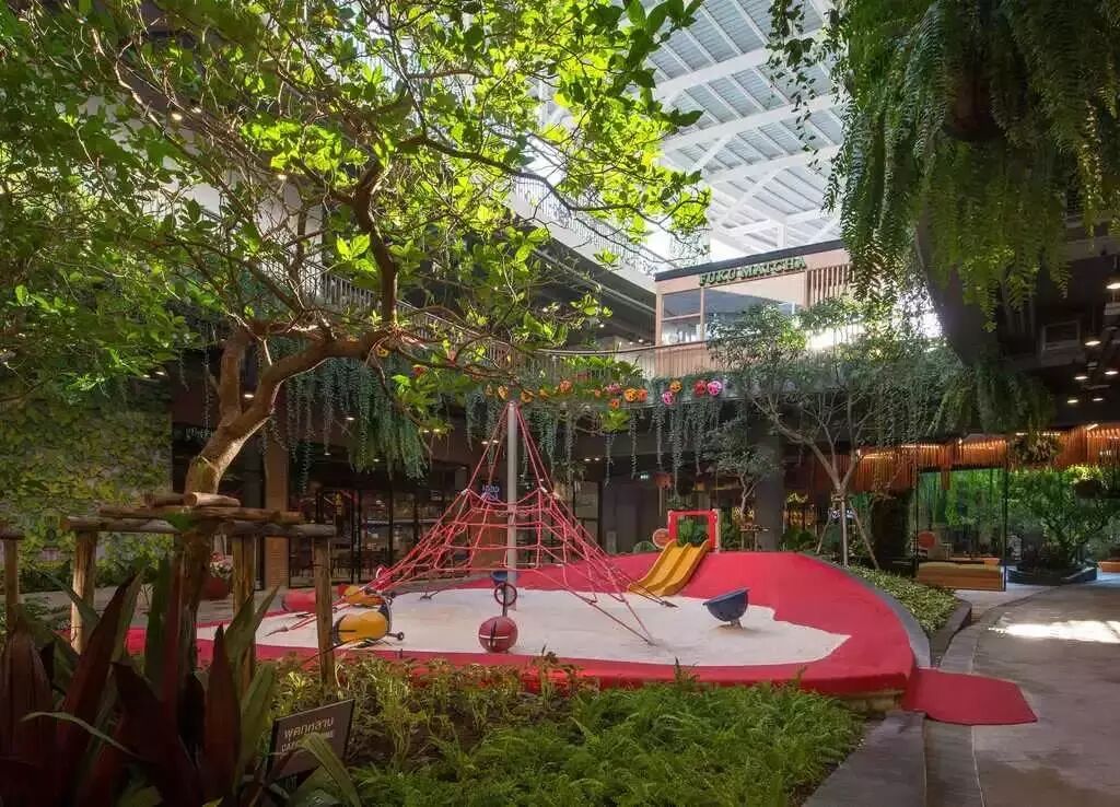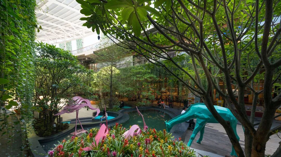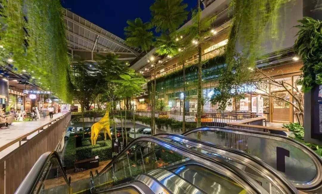 Central Festival EastVille坐落于泰国曼谷东区,邻近 Ekkamai-Ram Indra高速公路,于2015年11月正式开业,由泰国知名的地产及零售巨头中央集团斥资60亿泰铢打造社区商业,该项目采用“商业+街区”的建筑形态,定位为以自然为主题的社区型家庭购物中心,景观设计结合了在自然环境和植物中购物的新体验,并将这些自然元素与动物工艺品融合在一起,它将室内和室外完美结合,让购物中心“长”出了热带雨林,创造了“城市丛林”的氛围。