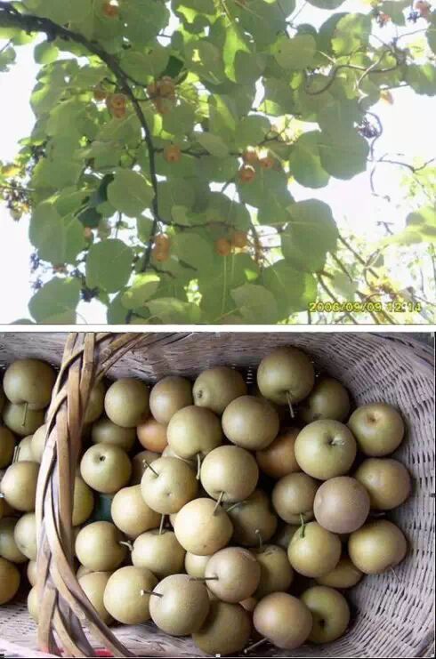 现代梨的野生种。种类也有很多,多数见的是肖梨,个不大,水分中等,多麻点,常长得歪歪扭扭,味道还不错;还有东瓜胖,个子很大,成熟后水分也多,品质比较好。