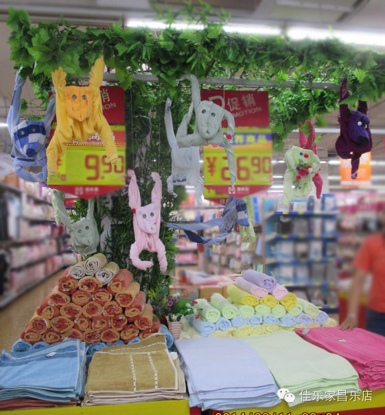 卷曲的毛巾浴巾做出的灵猿,造型活泼生动、灵巧可爱,展现商品柔软亲肤的特性,大树,枝繁叶茂、生机盎然,表达亲近大自然。