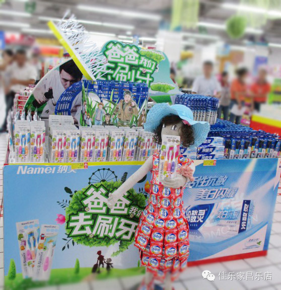 时尚的主题、超大的牙杯、牙刷,激发孩子主动刷牙的兴趣,拉动了与儿童消费群体的距离。特殊陈列道具:废旧的牙刷底座制成杯子;废旧的KT板和喝奶的吸管制成的牙刷;用洗衣粉赠品装饰的儿童模特。