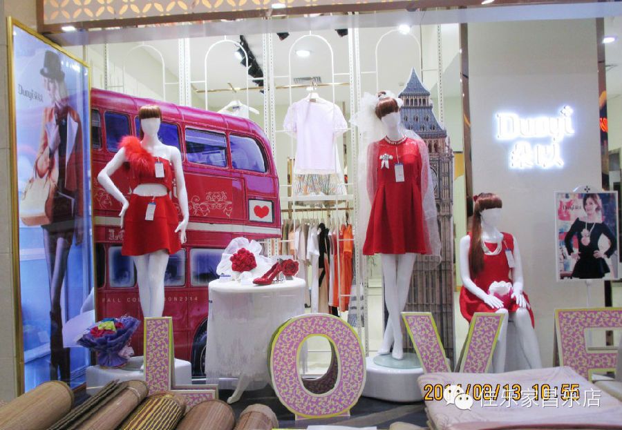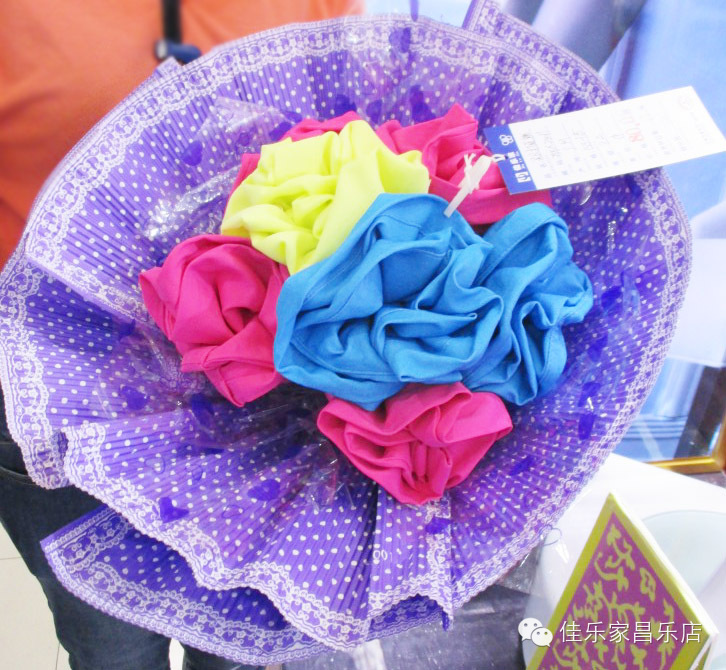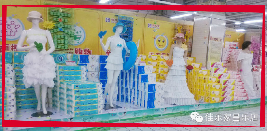 爱是缠绵,是时时刻刻心相连,爱是执着,是山盟海誓不改变,运用了中西婚礼文化的结合,橱窗主题突出,氛围道具丰富。让超市有了精品店的感觉。素材:T恤搭成的玫瑰花束