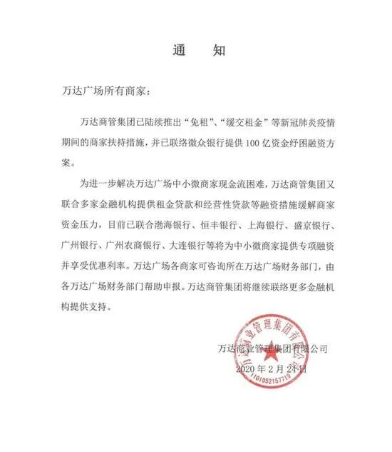 2月24日,万达商管集团宣布,为进一步解决中小微商家资金困难,万达商管集团集团又联合多家金融机构提供租金贷款和经营性贷款等融资措施缓解商家资金压力。目前已联合渤海银行、恒丰银行、上海银行、盛京银行、广州银行、广州农商银行、大连银行等金融机构。万达商管集团将继续联络更多金融机构提供更多支持,帮助中小微商户度过难关。