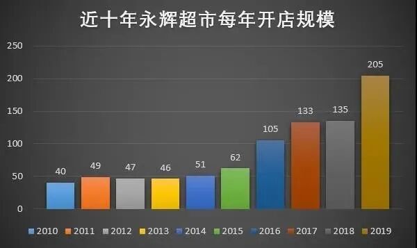 据统计,永辉超市2019年共新开门店167家(不含永辉mini店、永辉生活、超级物种),包括 Bravo YH(绿标店)门店160家(包括百佳永辉新开7家)、永辉卖场(红标店)6家、永辉超市“集市生活”1家。2019年5月15日,38家百佳永辉门店正式并入永辉超市系统。如此一来,永辉超市2019年新增门店达205家,开店数量已经连续六年保持增长。截至2019年12月31日,永辉超市全国已开业超市门店910家,筹建储备门店233家,门店覆盖全国28个省份、529个市(区、县),经营面积超过600万平方米。据悉,2020年,永辉超市仍将保持全国拓张的态势,开店目标大约在150家左右。
