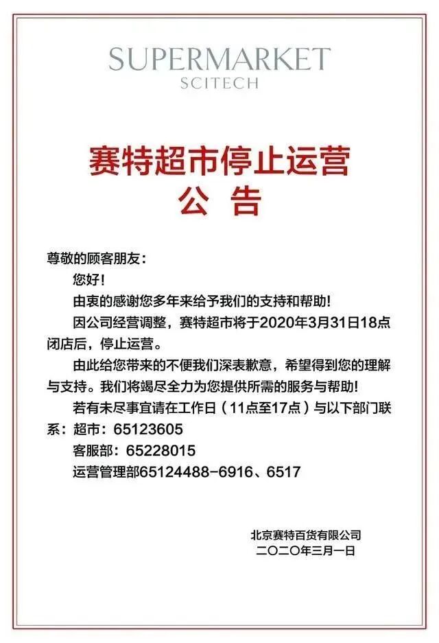 3月1日,北京老牌高端商场赛特购物中心宣布,赛特超市将于3月31日18点闭店后停止营业。闭店后,赛特购物中心将全面进行升级改造,并更名为“赛特·碧乐城”,在2020年底前以高端购物中心的面貌重新亮相。据了解,赛特购物中心闭店的消息最早从2019年4月传出,2019年6月底赛特购物中心基本关闭,之后只剩地下一层的超市仍在经营。
