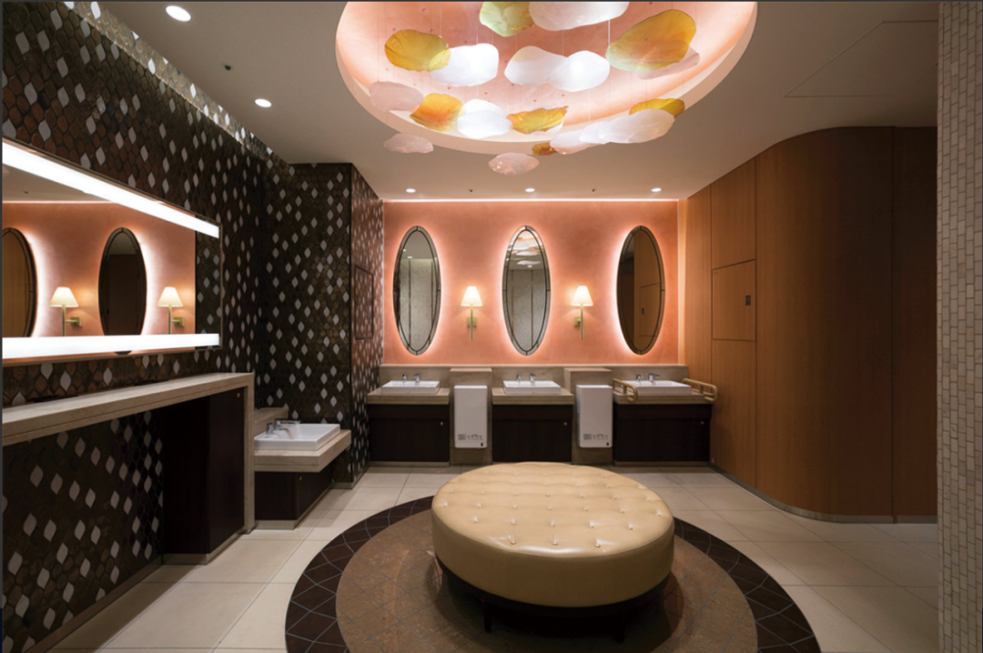 女士洗手间内中央有圆形沙发,方便客人整理东西,等待。