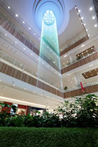 采用现代科技产品,在项目内两处12米高的内墙上,一面是垂直花园绿植景观,一面设置了3D电子瀑布。