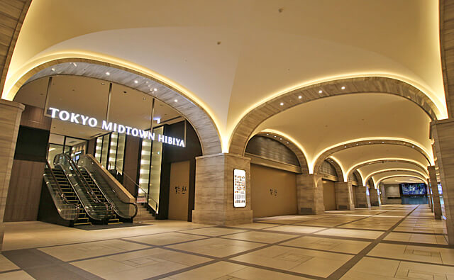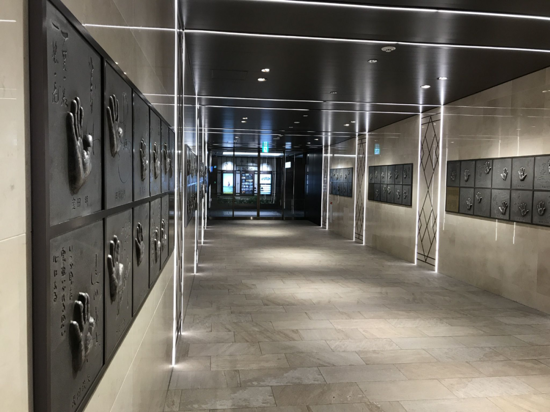 日比谷中城B2,日比谷拱廊,可通往两条地铁线,拱廊通向旁边的東宝日比谷大厦方向沿线墙壁上设置有共77位名人的手印。