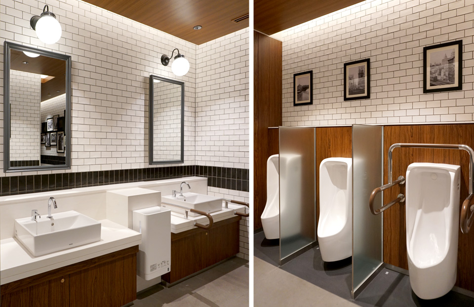 每个洗手间外都配有平面图,不同功能的洗手间配备齐全。如居家般环境的洗手间装饰。