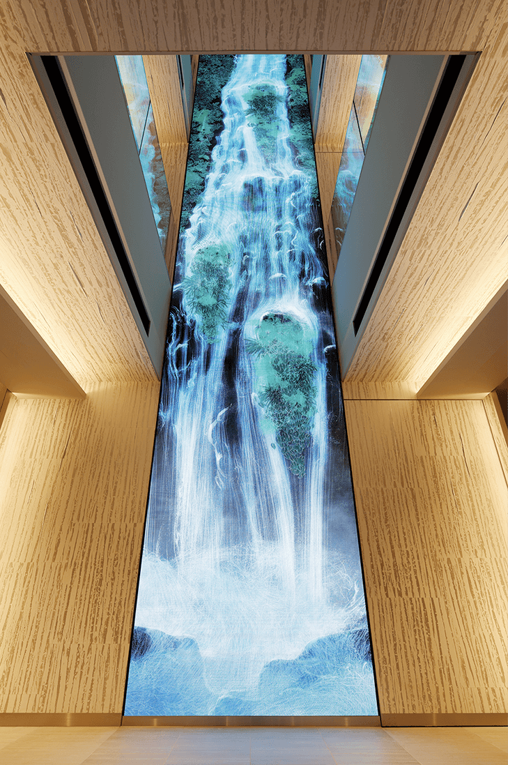 通过音乐和光源的演出效果变换空间的表情,设置了高度为14米的从上至下的水幕。水和绿植的交织是格林木的象征。