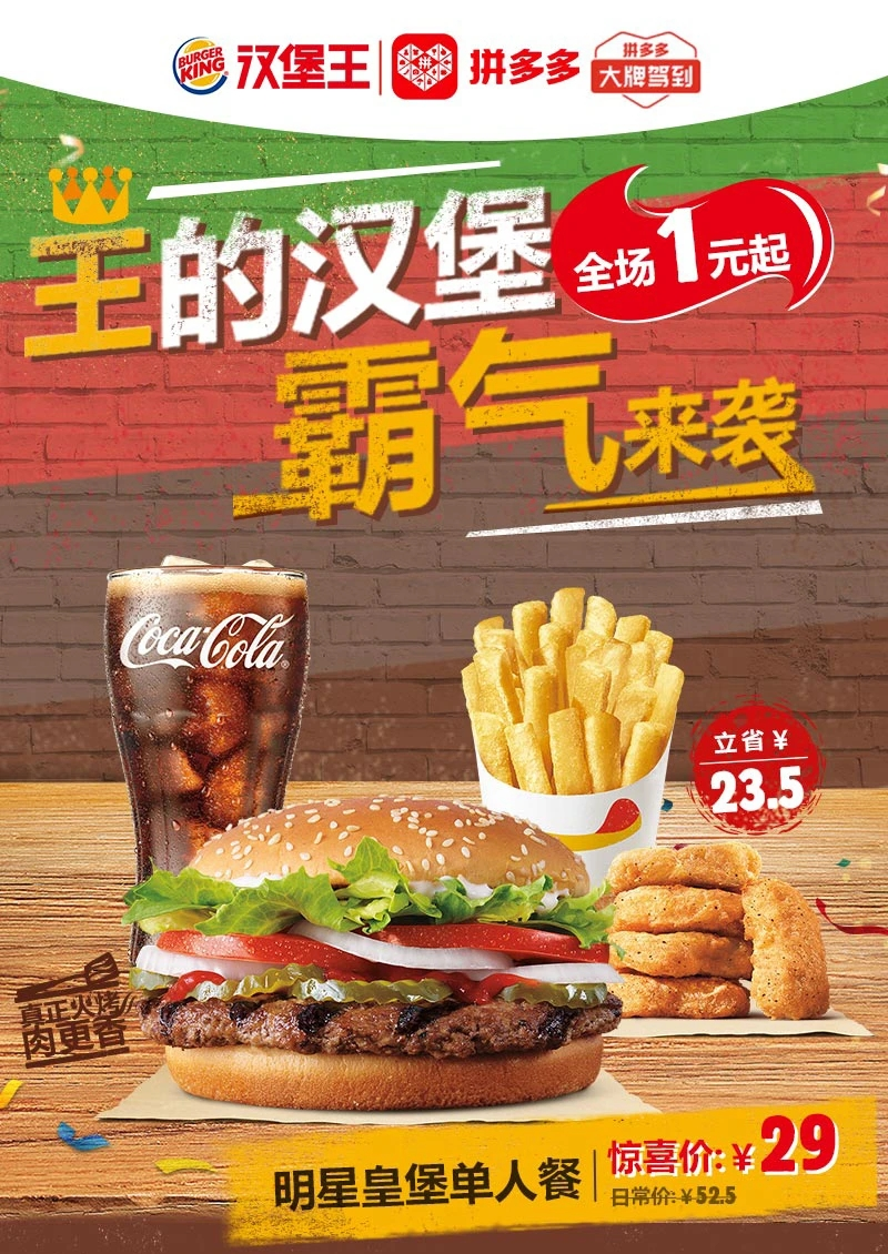 5月15日,汉堡王正式入驻拼多多开设官方旗舰店,加入拼多多首届“好吃节”大牌食品阵营,并通过百亿补贴、万人团、联名款套餐等。5月15日至17日的“好吃节”活动期间,拼多多为汉堡王推出了1000份整点秒杀1元小皇堡的活动,通过百亿补贴打造各种明星单品、套餐的全网最低价,还有iPhone等抽奖活动。