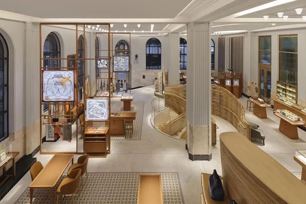 门店入口保留了建筑原始大门的设计,开口面向国王大街和卡斯尔雷街的交汇处。走进店内,舒缓的配色使到店的消费者感到心情愉悦,墙壁色彩从原始大理石中的蓝色获取灵感,并辅以白色饰面的纹理质感。一楼有珠宝、手表、丝绸和皮革配饰等。对于美容、香水爱好者来说,爱马仕全新推出的美妆产品及香水也都可以在这一层找到。