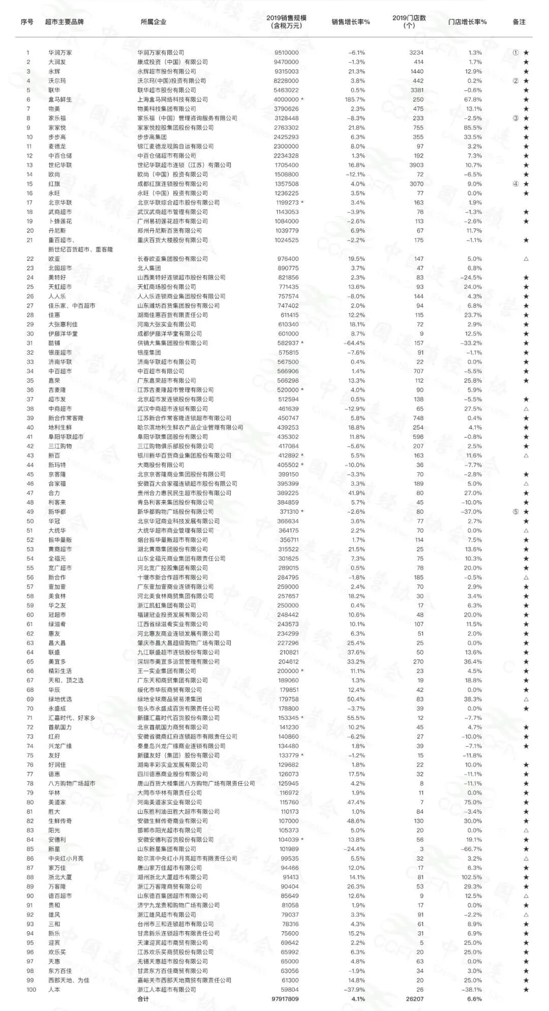6月29日,CCFA发布《2019年中国超市百强榜单》,排名前三的分别是华润万家,大润发和永辉。2019年中国超市百强销售规模为9792亿元,同比增长4.1%,约占全年社会食品零售总额的18.1%;超市百强企业门店总数为2.6万个,比上年增长6.6%。超市百强以区域企业为主。所经营门店只在本省发展的百强企业有54家;跨区域,门店覆盖20个及以上省级区域企业有10家。从人效、平效、周转率、同店可比销售等四个指标看,超市百强整体表现稳中有升。此外超市百强的人工成本和房租成本基本稳定,重点项目稳步推进。