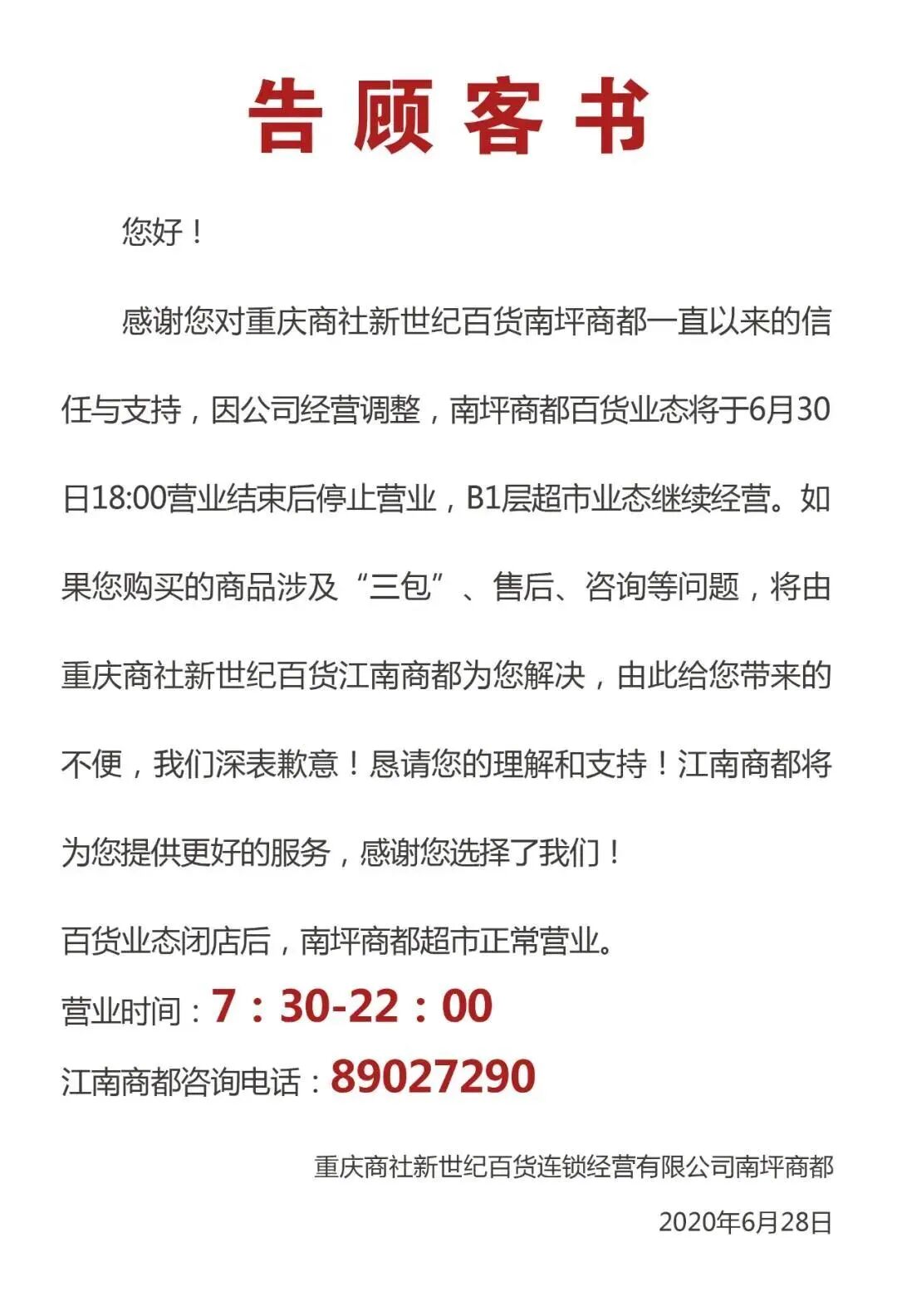 6月28日,《新世纪百货南坪商都》微信公众号发布一则告顾客书,因公司经营调整,重庆商社新世纪百货南坪商都百货业态将于6月30日18:00营业结束后停止营业,B1层超市业态继续经营。目前,商场一楼和二楼仍在营业,不过化妆品、饰品等商品大部分已经搬空,一部分夏装、凉鞋等在打折清仓,三楼以上的楼层早已关闭。