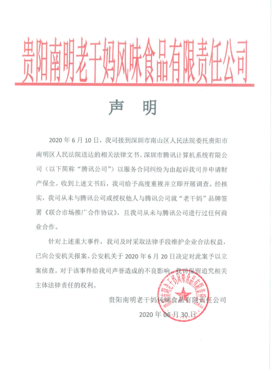 6月30日,从中国裁判文书网获悉,深圳市南山区人民法院发布一则民事裁定书,同意原告腾讯请求查封、冻结被告老干妈公司名下价值人民币16240600元的财产。对此,老干妈公司相关负责人曾回应表示,并没有与腾讯有任何的合作,关于此事老干妈公司认为,腾讯公司被骗了!老干妈发布声明称,经核实,我司从未与腾讯公司或授权他人与腾讯公司就“老干妈”品牌签署《联合市场推广合作协议》,且我司从未与腾讯公司进行过任何商业合作。针对上述重大事件,我司及时采取法律手段维护企业合法权益,已向公安机关报案。