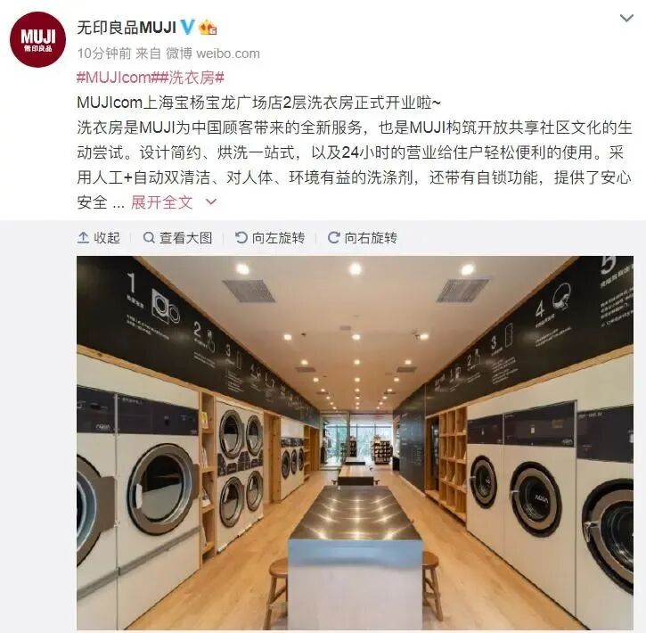 2月5日,无印良品MUJI官方微博公布,MUJIcom上海宝杨宝龙广场店2层洗衣房正式开业了。设计简约、烘洗一站式,以及24小时的营业给住户轻松便利的使用。洗衣房是MUJI为中国顾客带来的全新服务,也是MUJI构筑开放共享社区文化的生动尝试。