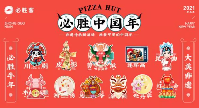 2月3日,必胜客跨界联合11大非物质文化遗产推出非遗主题餐厅,将北京兔爷、四川川剧等一系列民俗艺术以年轻化的方式呈现,将非遗元素融入室内设计,部分餐厅还运用高科技手段呈现出非遗光影体验。同时,在倡导就地过年的背景下,必胜客首次推出新春年夜饭。