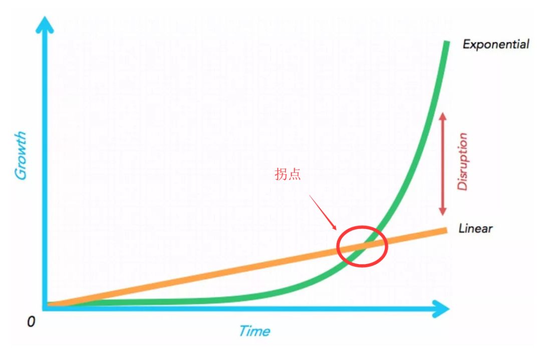 指数增长超越线性增长的交叉点,即是“指数飞轮”增长的拐点,在这一点后,指数增长的效应发挥出来,超越传统线性的倍速增长。